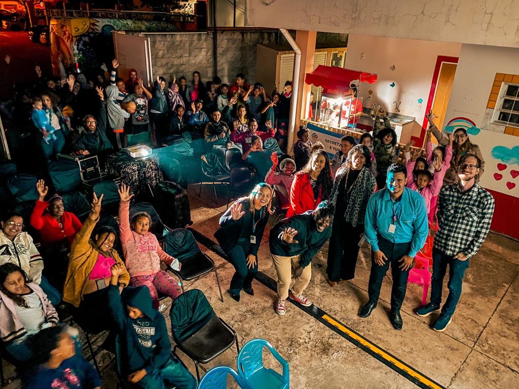 Teve sessão gratuita de cinema no campinho ao lado da CEMEI Erlete Ortigoza, na Rua Tuffic Nicolau, s/º, no Jardim Orlando Chesini Ometto, na noite de 18/05.