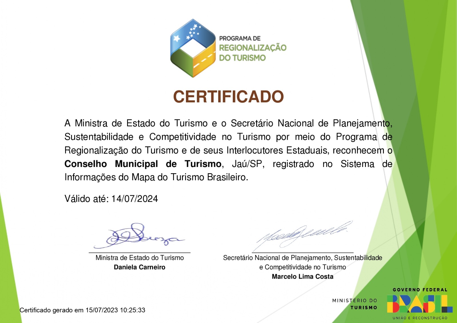 A certificação foi chancelada pelo Programa de Regionalização do Turismo, plano estruturante do Ministério do Turismo, que trabalha a convergência e a interação de todas as ações desempenhadas pelo órgão federal com estados e municípios brasileiros. O Conselho Municipal de Turismo também recebeu a certificação.