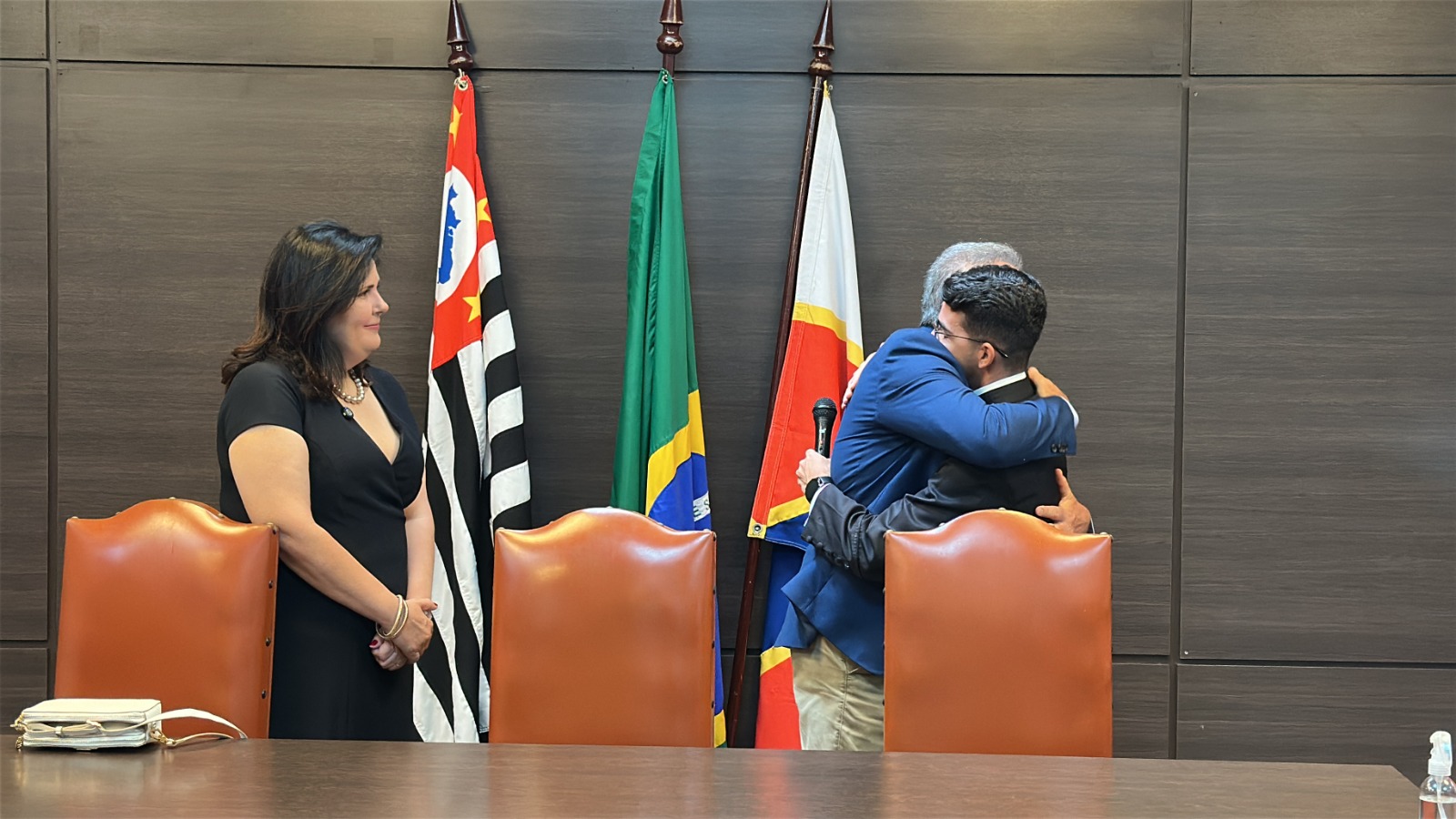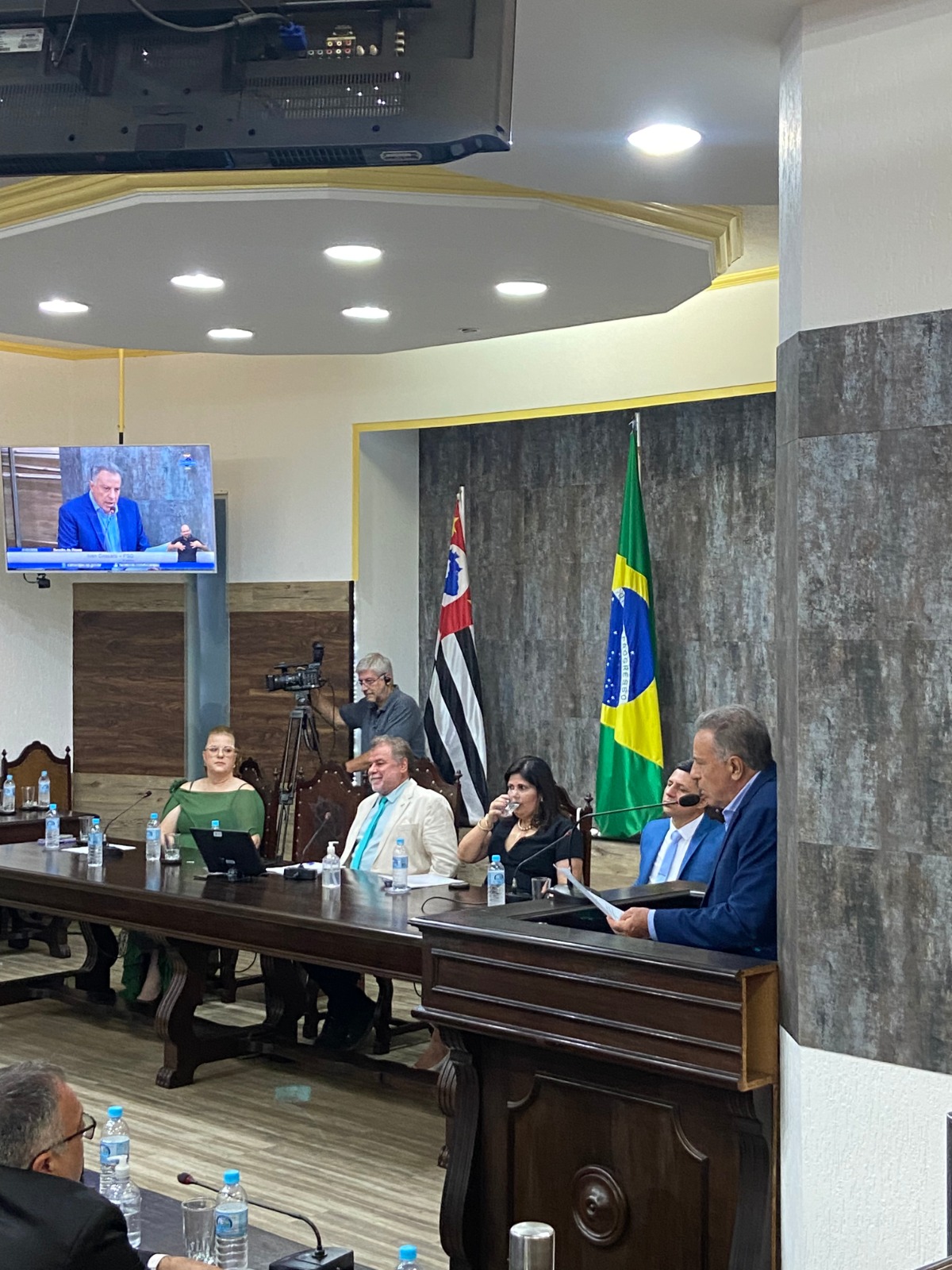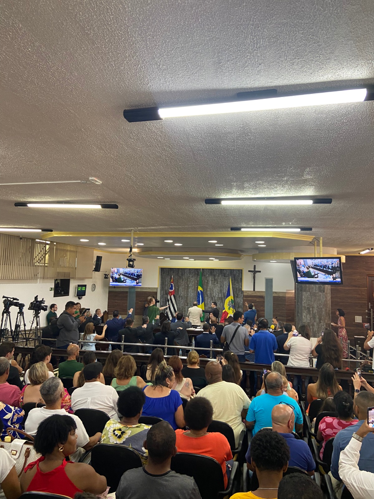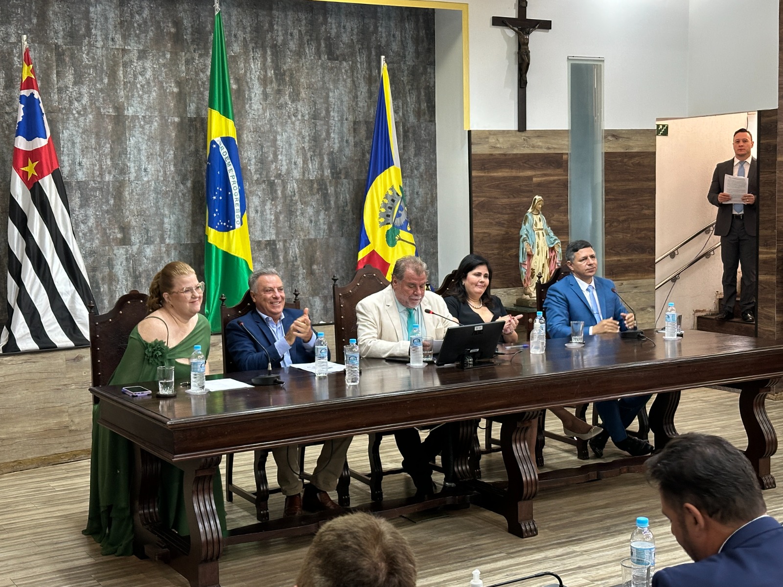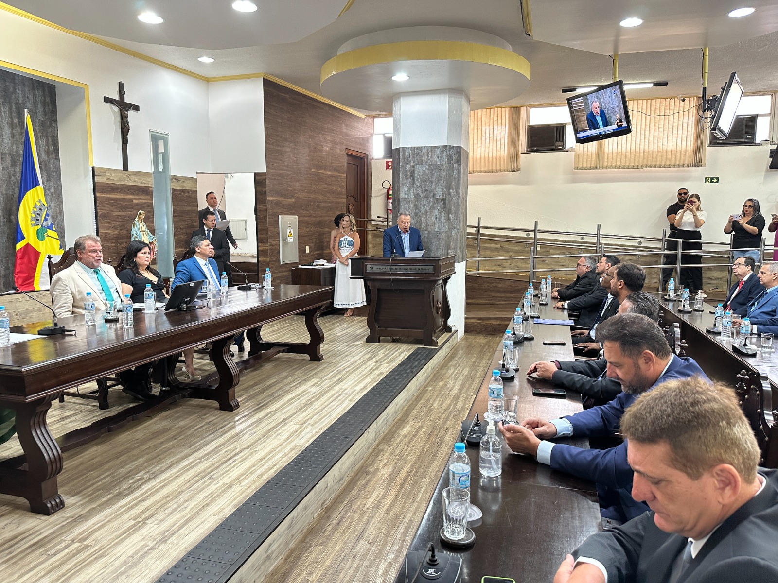 A solenidade também marcou a posse da primeira mulher a assumir um cargo eletivo no Poder Executivo da cidade, a vice-prefeita Juliana Fabre (PL).